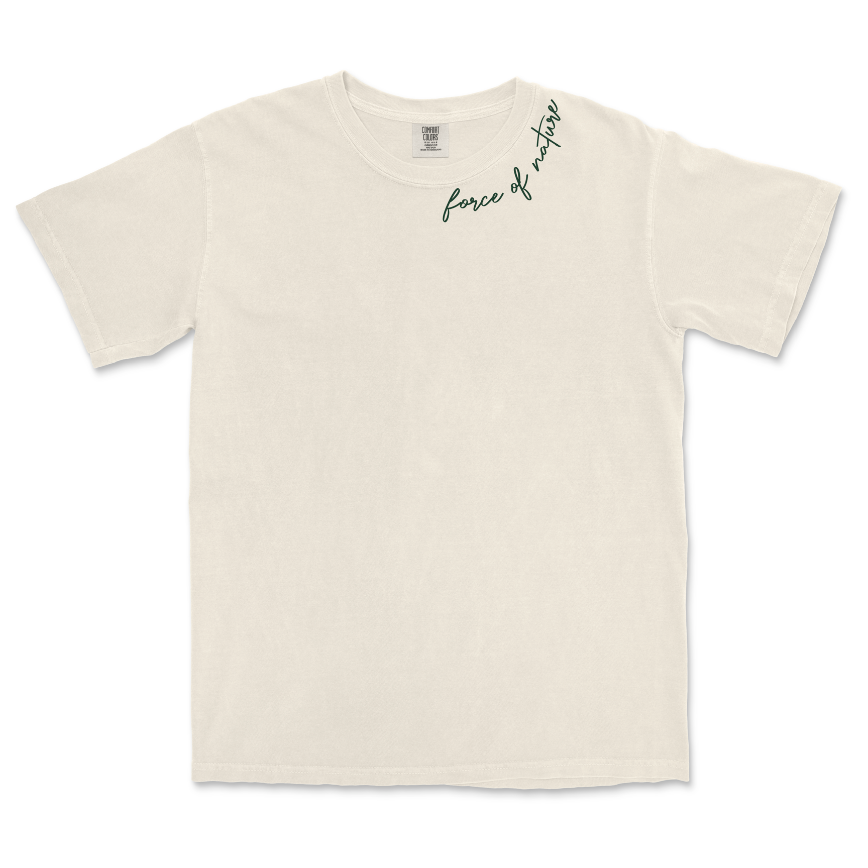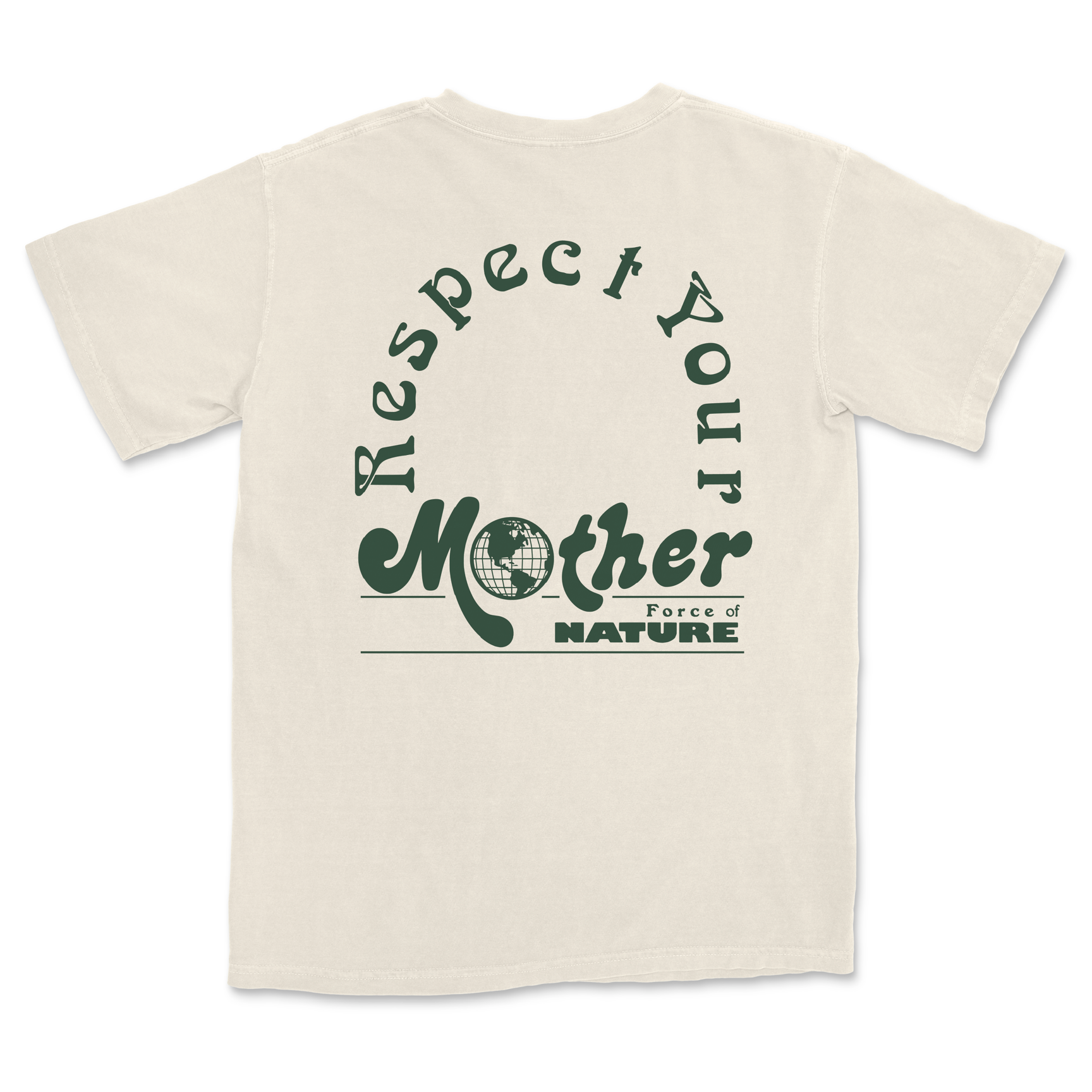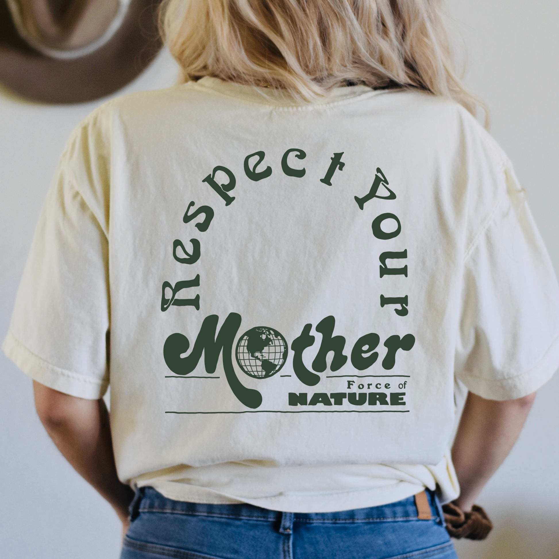 Natural comfort colors tee embellished with “Respect your mother” on the back and "force of nature" on the collar with a vintage forest ink